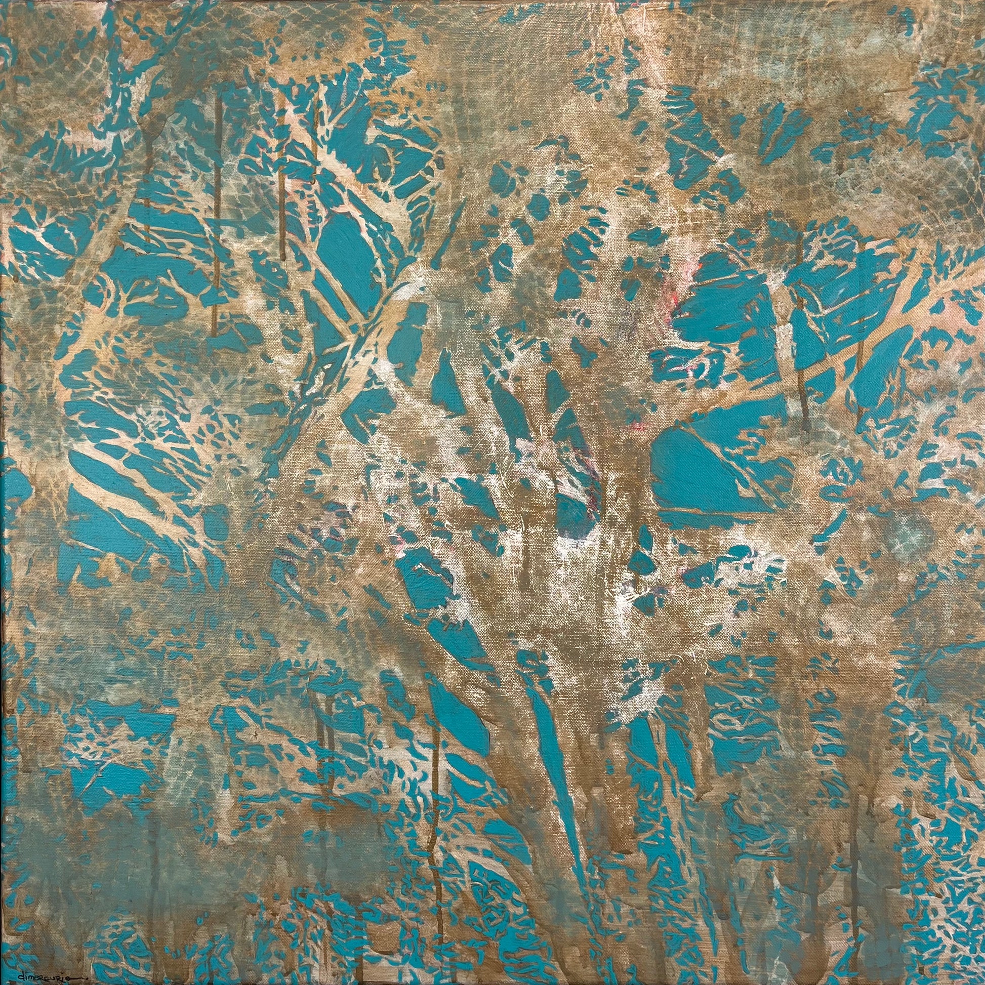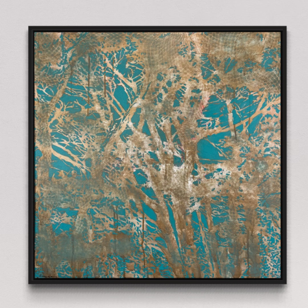 Turquoise and soft whites ripple through the foliage, accented by a subtle bronze shimmer. Built with layered acrylic, spray paint, and ink, the surface reveals hidden depths and texture.