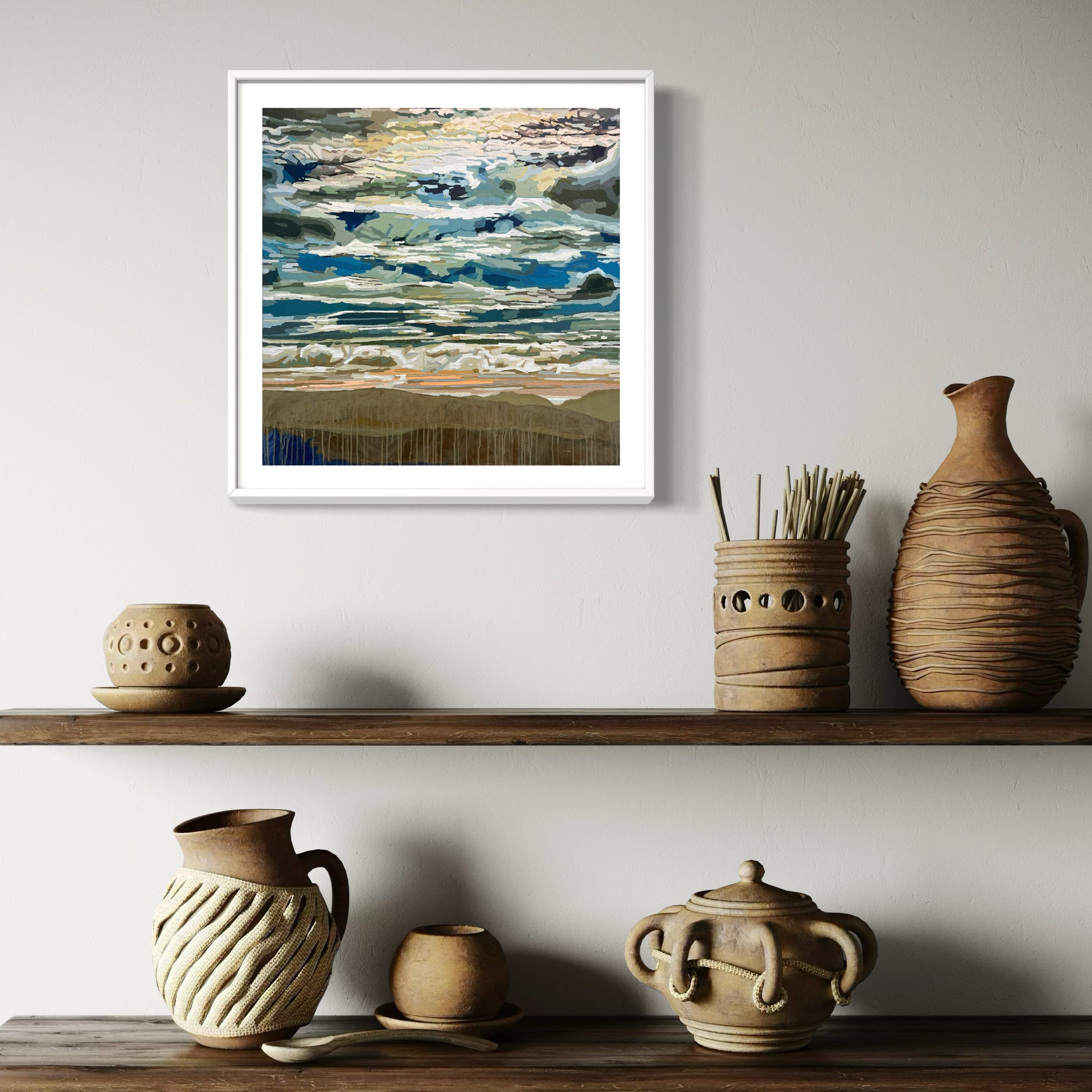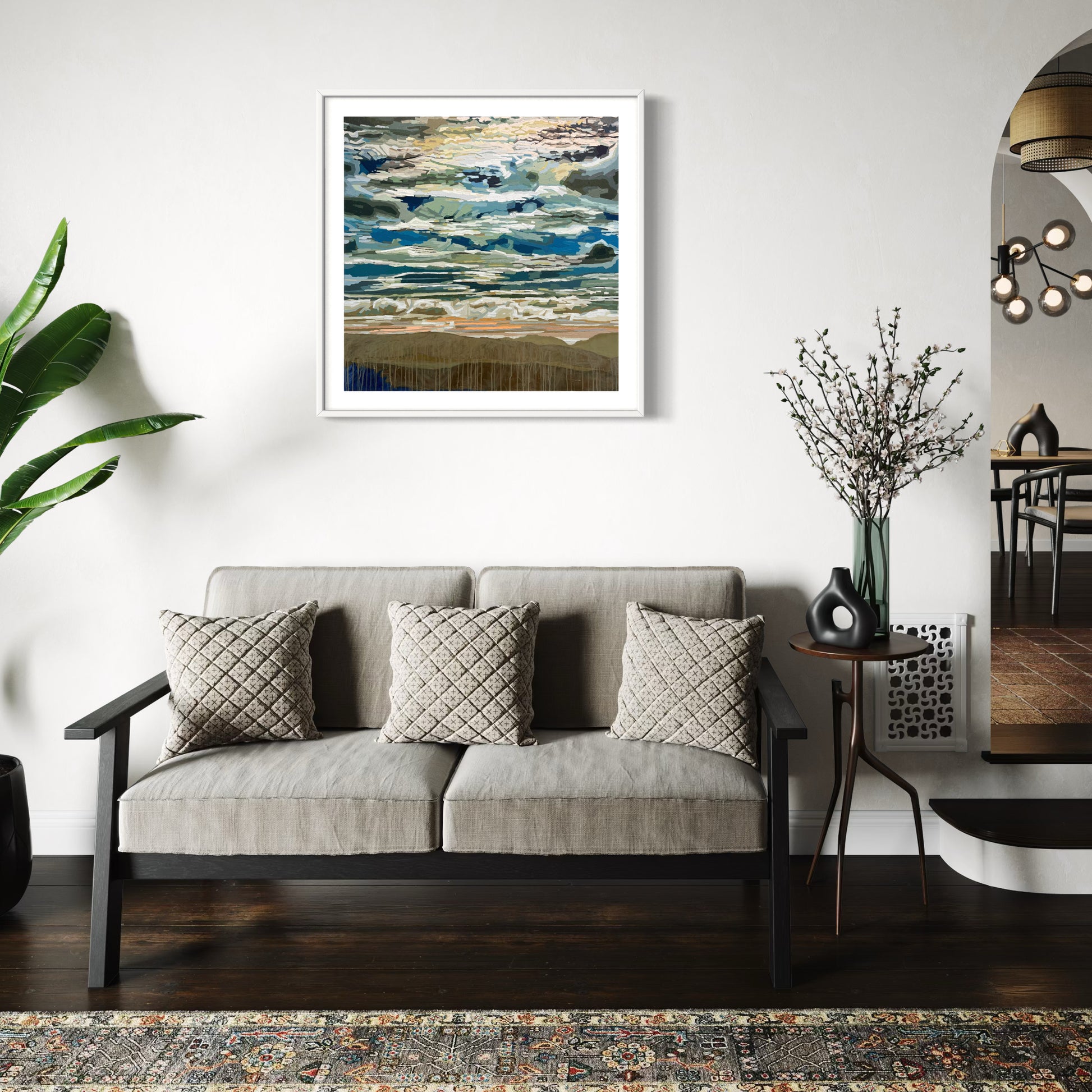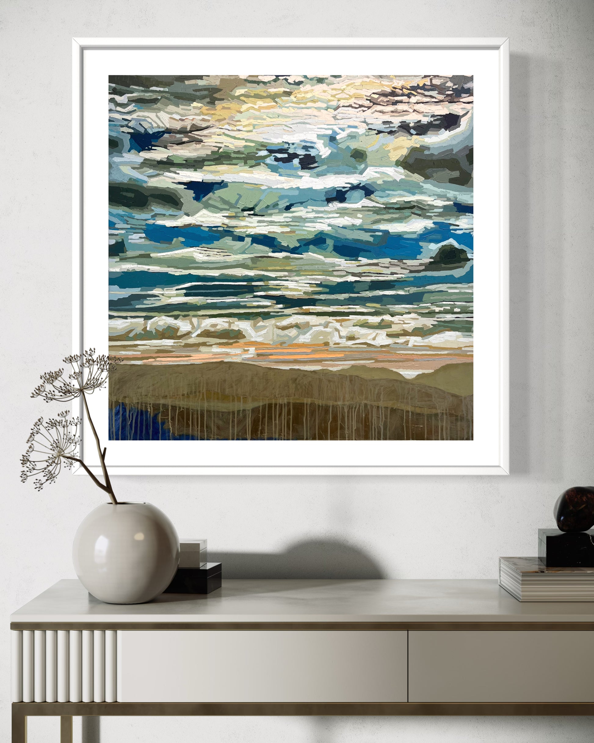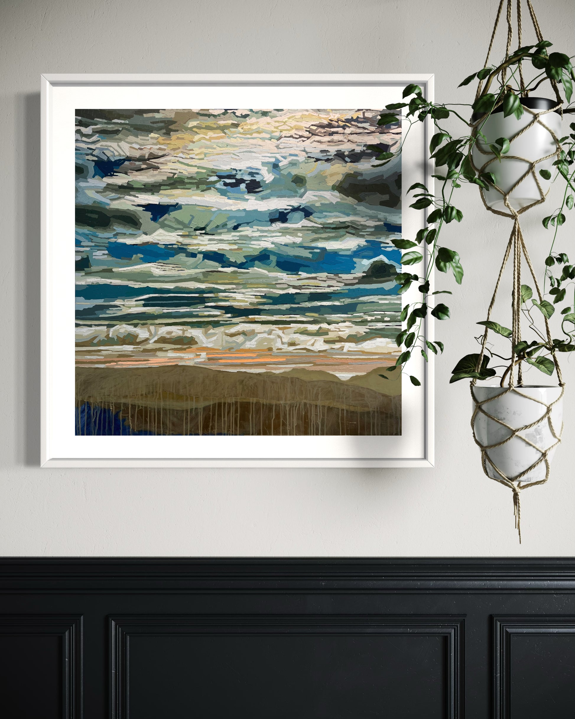 Inspired by the ephemeral magic of morning sunlight glowing over the misty Ōrongorongo ranges, this artwork captures the beauty of light filtering through layered clouds. Based on an original, highly textural painting, it balances vibrant realism with abstraction, drawing the viewer into a serene and immersive cloudscape.